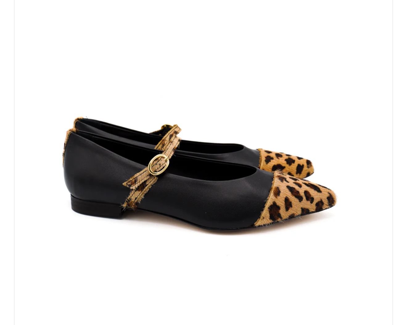 Un modello che unisce grinta e raffinatezza: queste ballerine interpretano lo stile animalier in chiave chic grazie al contrasto tra il pattern maculato e la punta affusolata in vernice nera. Il cinturino sottile con fibbia dorata aggiunge un dettaglio femminile e retrò, mentre la suola bassa assicura comodità per tutto il giorno. Perfette per chi desidera un accessorio distintivo, capace di valorizzare anche il look più semplice.