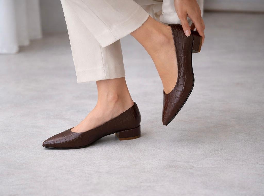 Elegante e raffinata, questa ballerina con punta affusolata è realizzata in pelle nappa con stampa cocco, che dona carattere e un sofisticato effetto texture. Il design essenziale è valorizzato dal tacco basso squadrato, pensato per garantire comfort e stabilità durante tutta la giornata.