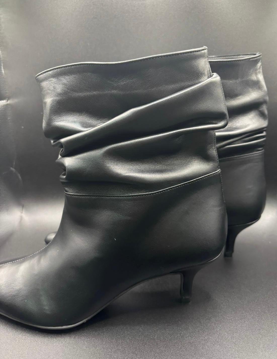 Questi stivaletti in pelle nera liscia si distinguono per la loro eleganza discreta e la versatilità senza tempo. La punta affusolata dona slancio alla silhouette, mentre il tacco basso e sottile offre un equilibrio ideale tra stile e comfort.
