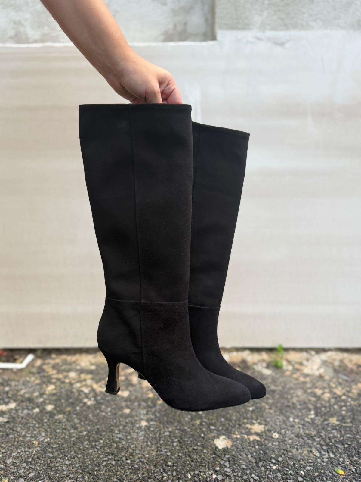 Realizzati in un materiale effetto suede, presentano una linea pulita e slanciata che avvolge la gamba con un profilo essenziale, morbido e uniforme. La punta affusolata dona finezza, mentre il tacco sottile — leggermente svasato nella parte inferiore — aggiunge un tocco chic senza rinunciare alla stabilità.