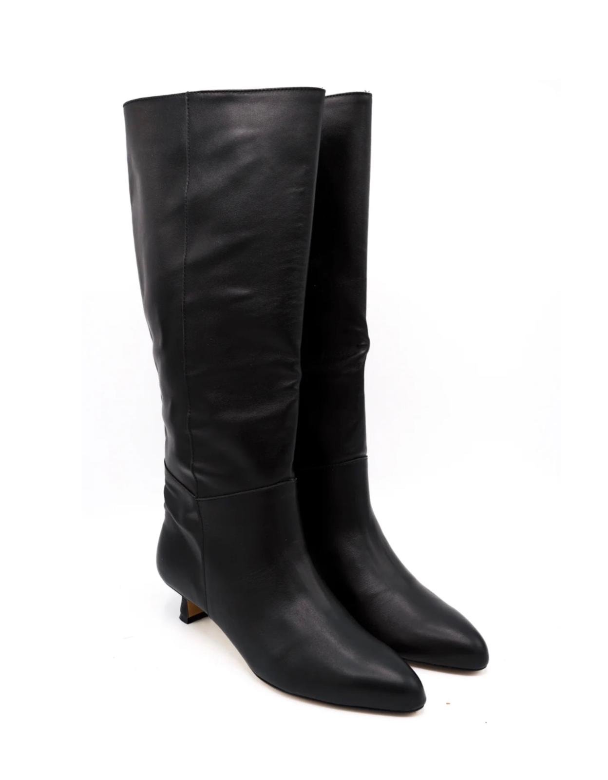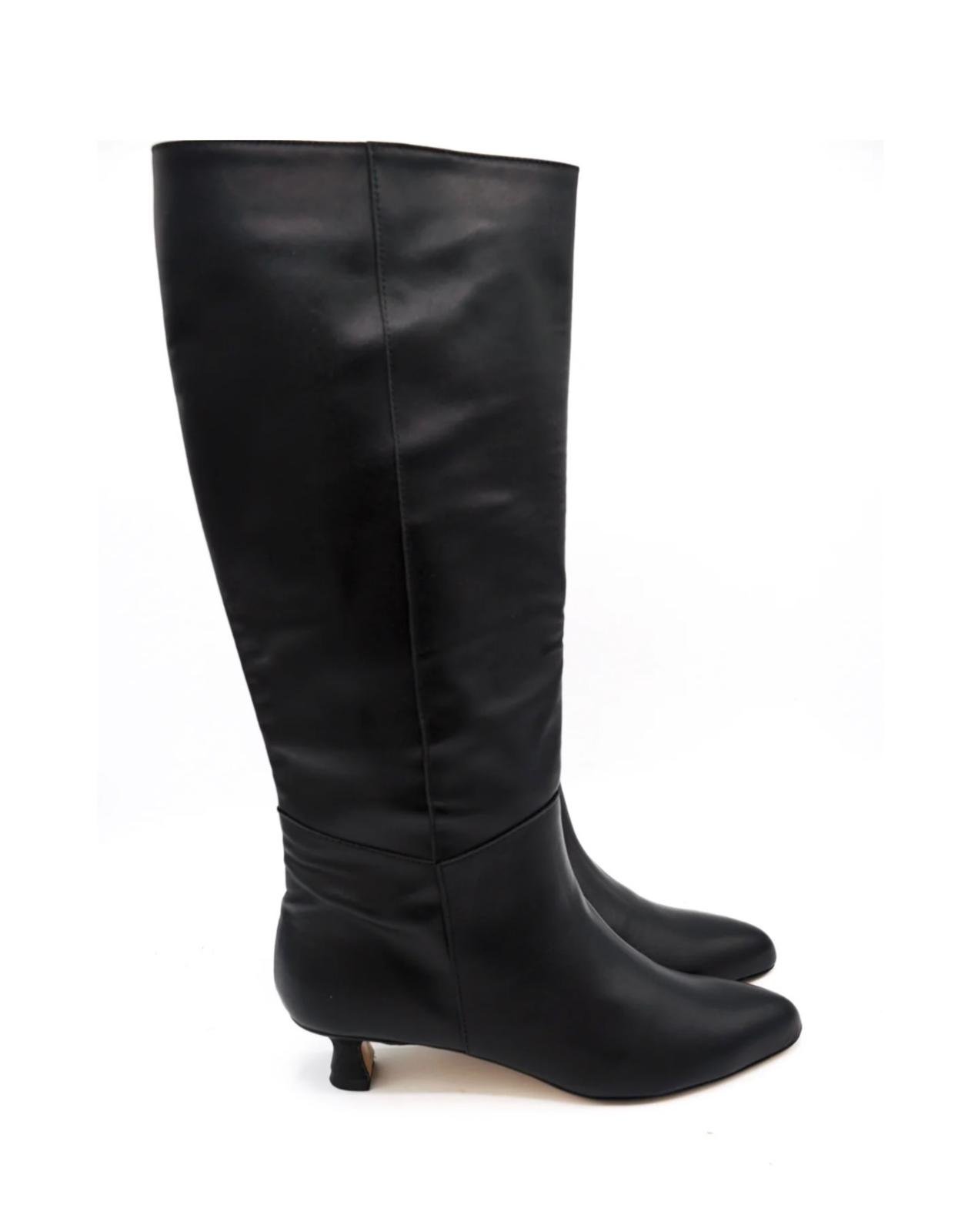 Realizzati in pelle liscia nera, si distinguono per il gambale alto che arriva sotto il ginocchio e per la linea perfettamente dritta che dona un effetto slanciato alla gamba. La punta leggermente arrotondata garantisce comfort senza rinunciare all’eleganza. Il tacco basso e sottile, in stile kitten heel, permette di mantenere una postura femminile pur assicurando stabilità e comodità per l’uso quotidiano. La costruzione sartoriale e le cuciture discrete conferiscono allo stivale un look raffinato e pulito.