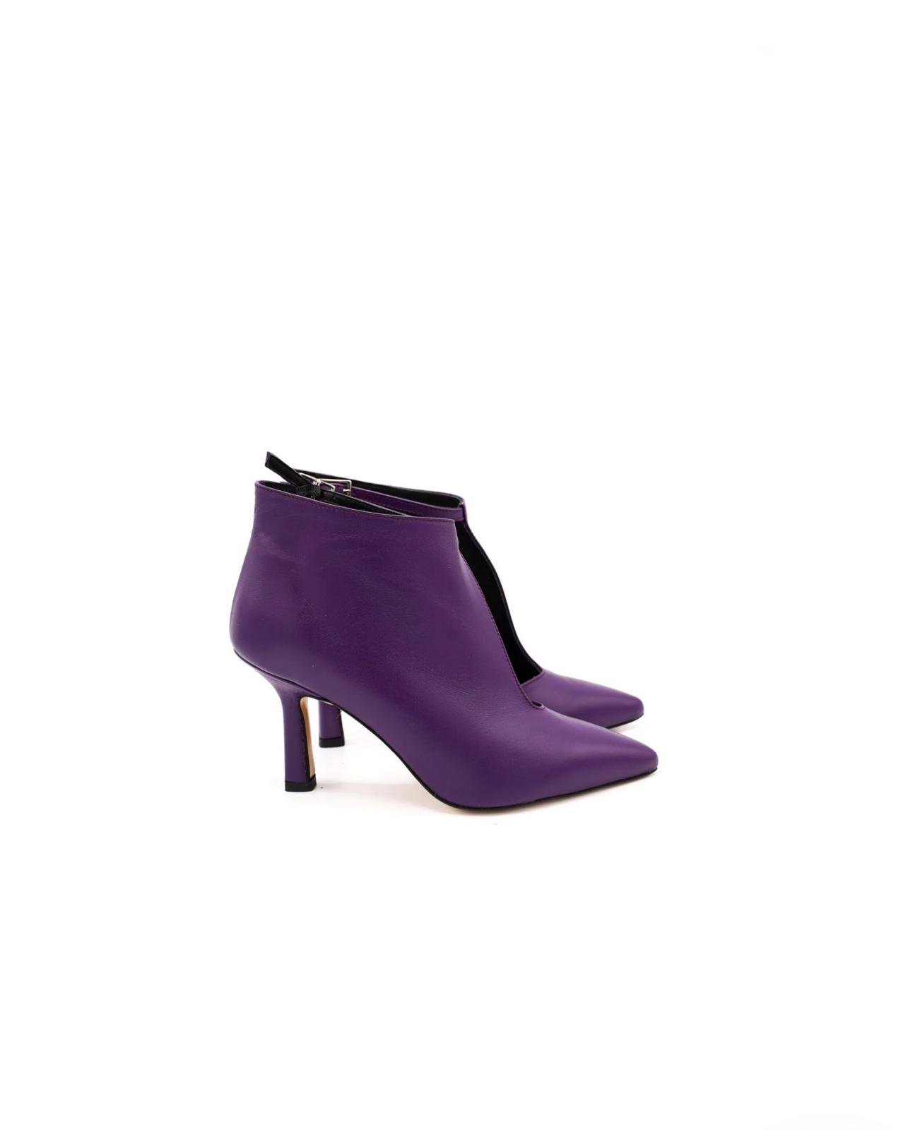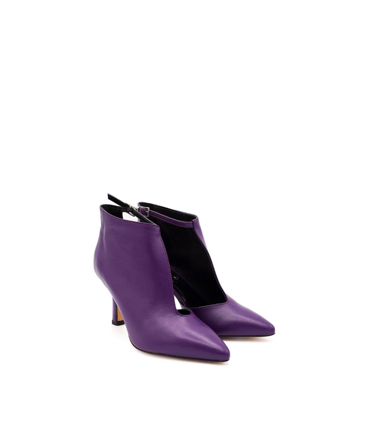 Questi tronchetti in nappa viola sono una dichiarazione di stile immediata. Caratterizzati da un design moderno e scultoreo, presentano una profonda apertura centrale che slancia la silhouette del piede e aggiunge un dettaglio architettonico dal forte impatto visivo.